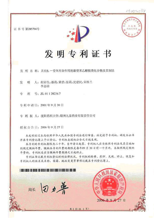 該產品正處于Ⅲ b臨床研究階段,已獲七項專利證書。 錦州九泰藥業與沈陽藥科大學合作開發的國家一類新藥鹽酸川丁...