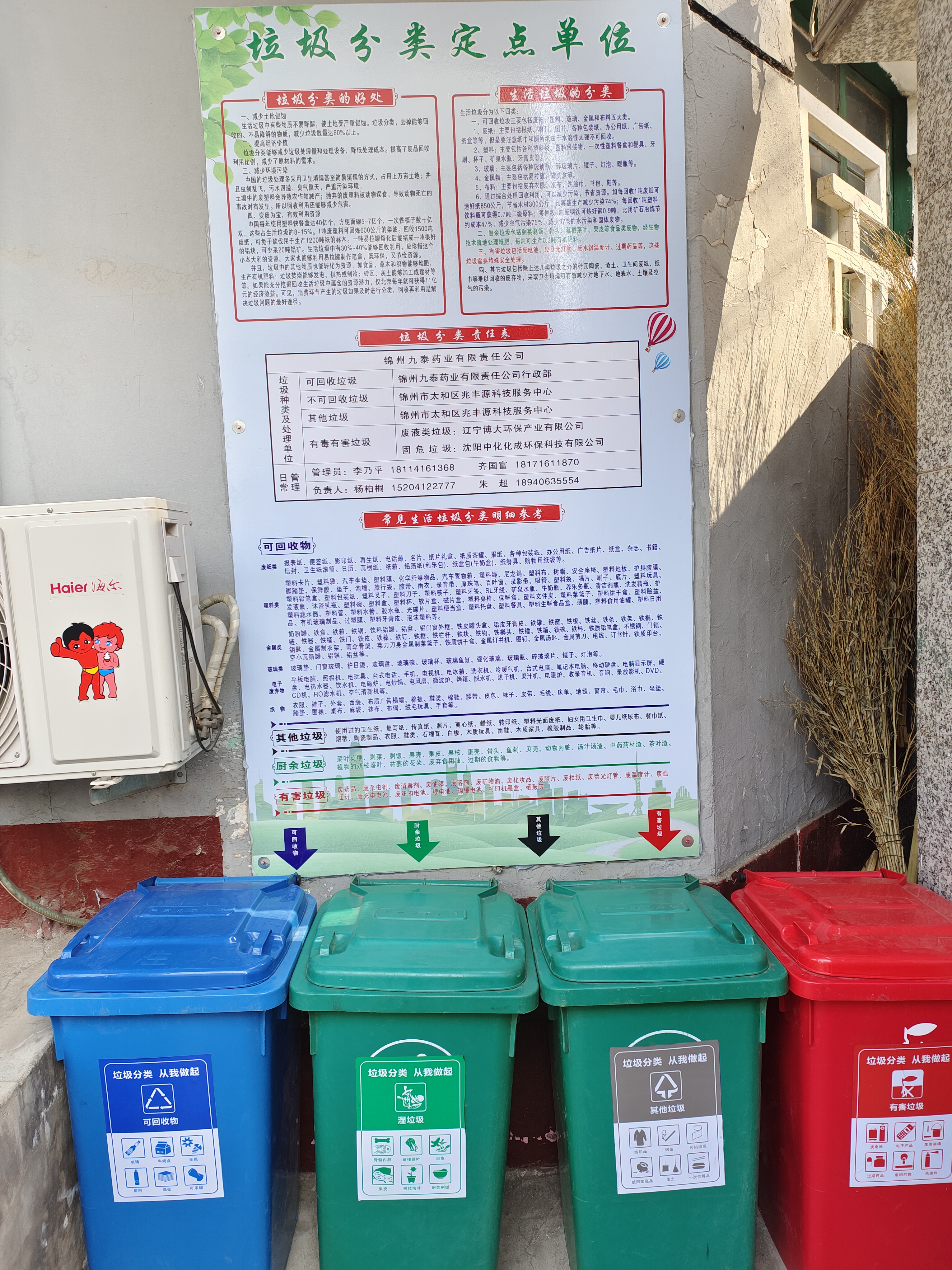 除以上規章制度的(de)建立(li)外,行政(zheng)部按(an)照(zhao)太和(he)區政(zheng)府(fu)的(de)要求,在與有(you)關部門(men)及單位的(de)共同配(pei)合下,把九泰藥業作為“垃(la)圾分(fen)類(lei)定點單位”的(de)相關工作認(ren)真迅速(su)的(de)落(luo)實(shi)了下去,并在第一時間對(dui)各(ge)個部門(men)進行了垃(la)圾分(fen)類(lei)相關知識(shi)的(de)普及。